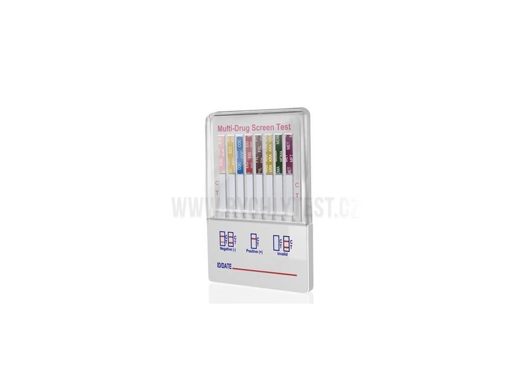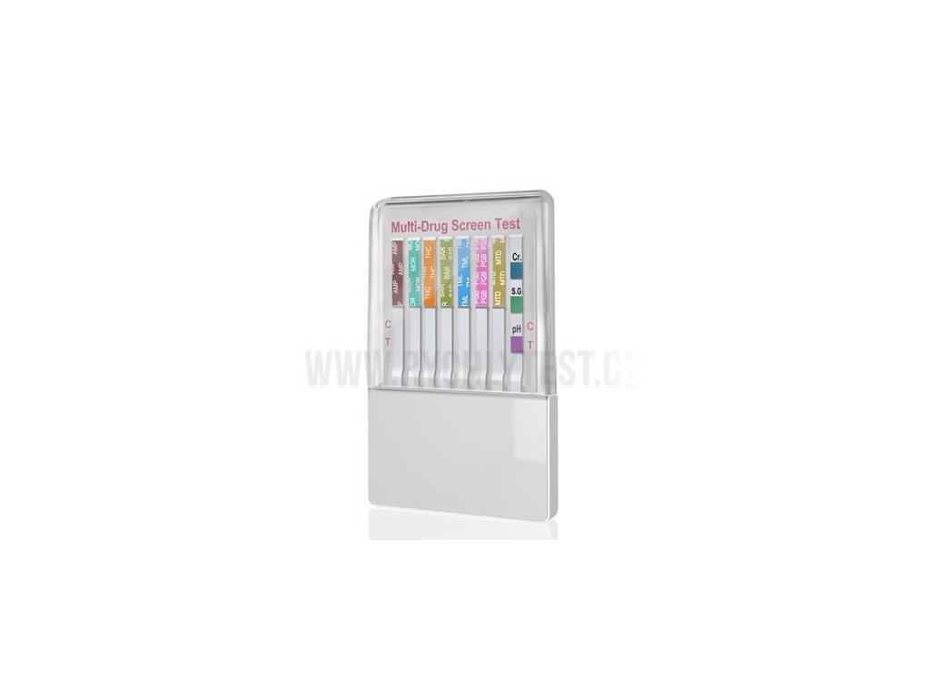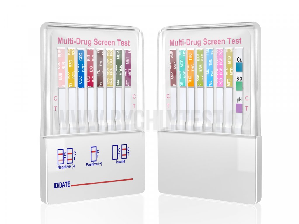 Test na detekci následujících drog a jejich metabolitů včetně testu na falšování vzorku: AMP300,MET300,MOR300,THC50,COC300,MDMA500,BZD300,BAR300,ETG500,MTD300,BUP10,FYL20,TML100,PGB500,KRA100 + 3 parametrový testovací proužek na falšování vzorku, který detekuje pH, kreatinin a specifickou hmotnost moče. Provedení testu je jednoduché, bez použití přístroje, vizuální odečet výsledku do 5 minut.